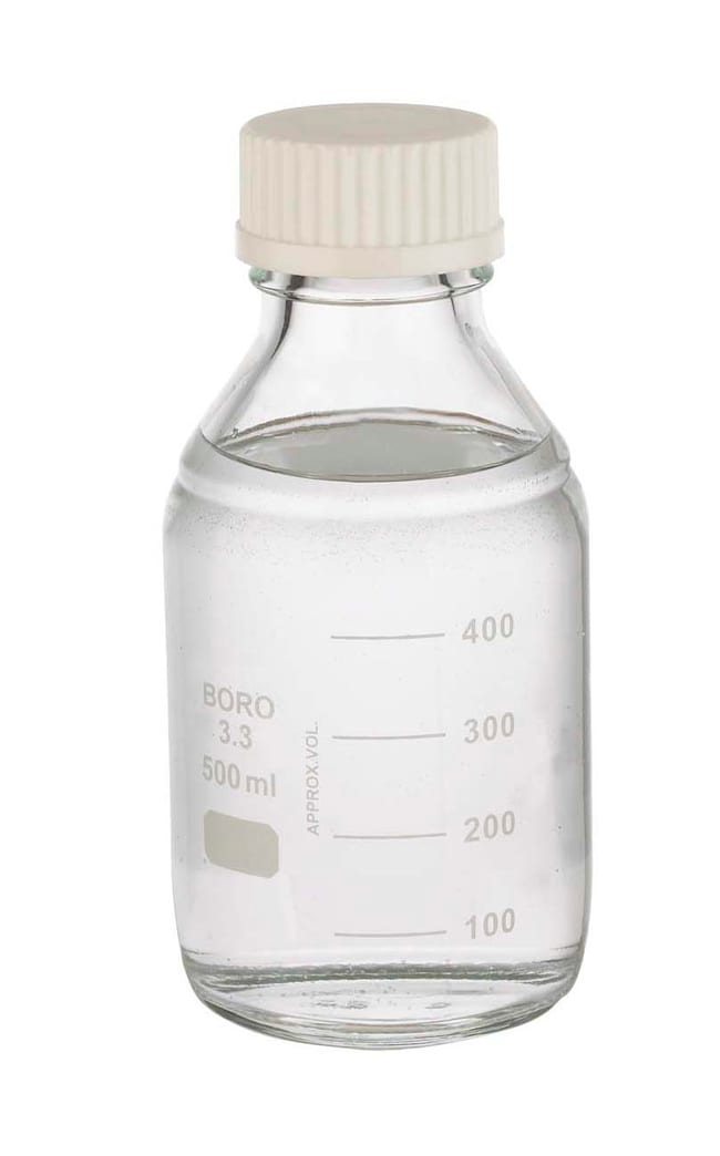 Multi-purpose graduated bottles designed for convenient storing or transporting of liquids. Constructed of heavy duty borosilicate glass for durability and chemical resistance. Bottles feature a wide 45mm screw thread finish, printed graduations and marking spot. Wide opening prevents fluid surge when pouring and rounded shoulders allow complete drainage of liquid. Supplied with white polypropylene cap and pour ring attached to bottle.
