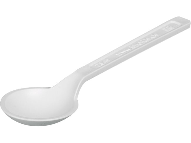 The spoon is available in two sizes, 0.08 oz. (2.5 ml) (0.08 oz.) (similar to a teaspoon) and 10 ml (0.34 oz.) (similar to a tablespoon), and is ideal for sampling powders, granulates and fluids.