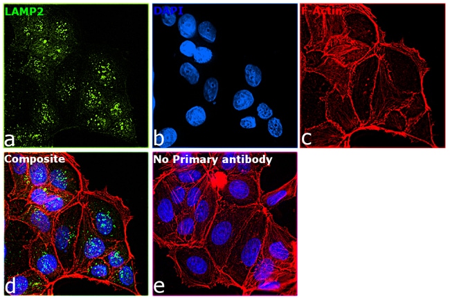 LAMP2 (Lysosome-associated membrane glycoprotein 2, CD107b) is a member of a family of membrane glycoproteins. LAMP2 provides selectins with carbohydrate ligands, and may play a role in tumor cell metastasis, and have a function in the protection, maintenance, and adhesion of the lysosome. Prior to posttranslational modification, LAMP2 is approximately 46 kDa polypeptide. Mature, functional LAMP2 is extensively glycosylated with a variety of different N-linked and O-linked oligosaccharides with a total molecular weight of about 100-130 kDa. LAMP 2 has a structure comprised of a large amino-terminal intra-lysosomal domain, a hydrophobic trans-membrane domain, and a short carboxyl-terminal cytoplasmic tail. LAMP2 is used to monitor a very selective form of autophagy called chaperone-mediated autophagy. LAMP 2 has a structure comprised of a large amino-terminal intra-lysosomal domain, a hydrophobic trans-membrane domain, and a short carboxyl-terminal cytoplasmic tail. The LAMP protein has 3 variant forms: LAMP-2A, -2B, and 2C. LAMP2, together with CD107a/LAMP-1, is a major constituent of lysosomal membrane. The LAMP proteins are involved in lysosome biogenesis and are required for fusion of lysosomes with phagosomes, and LAMP2 is an important regulator in successful phagosomal maturation. LAMP2 deficiency causes an accumulation of autophagosomes in many tissues leading to cardiomyopathy and myopathy (Danon's disease).
