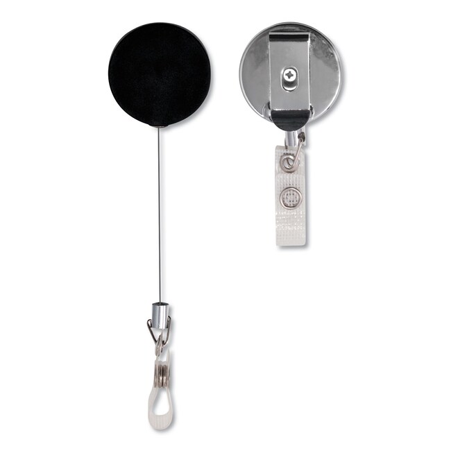 Retractable cord allows convenient scanning/swiping of cards Connects easily to any ID card or name badge Steel cord with plastic coating for extra sturdiness Belt/pocket clip with clear badge holder Cord Material(s)- Steel Cord Length- 24 Reel Frame Material(s)- ABS Plastic Color(s)- Black/Silver