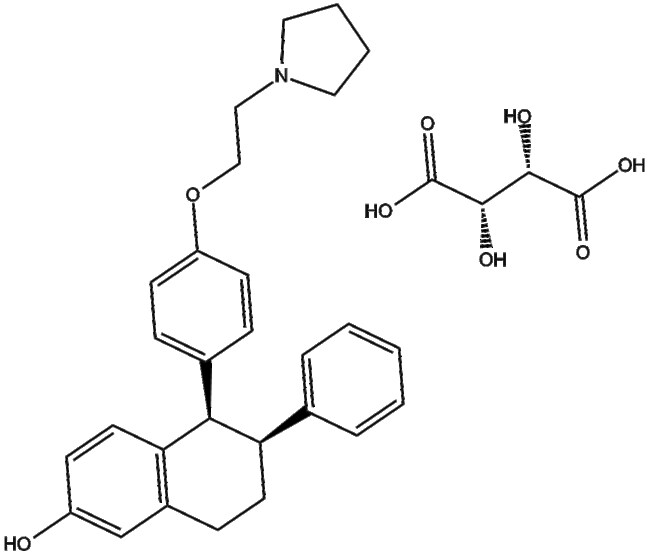 Lasofoxifene tartrate (CAS 190791-29-8) is a small-molecule selective estrogen receptor modulator (SERM) targeting estrogen receptor-alpha (ER- ) and acting as a selective inverse agonist at the cannabinoid receptor subtype CB2 It is designed to modulate estrogen receptor signaling in a tissue-dependent manner thereby regulating estrogen-related biological pathways Lasofoxifene tartrate exerts its biological activity through dual estrogen agonist antagonist actions depending on tissue context In preclinical studies using ovariectomized rat models Lasofoxifene tartrate prevents estrogen deficiency-associated bone loss reduces serum cholesterol and body mass without inducing uterine hypertrophy Based on these pharmacological properties Lasofoxifene tartrate holds research potential in the management of osteoporosis breast cancer and cardiovascular health in postmenopausal women