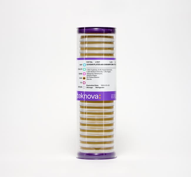 Teknova LB Agar Plates with Kanamycin-100. 100mm, 20 Plates per Sleeve, Sterile.