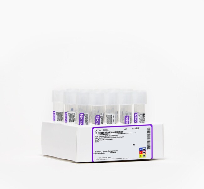 Teknova LB Broth with Kanamycin-50. 3mL Tube, Sterile. 25-Pack