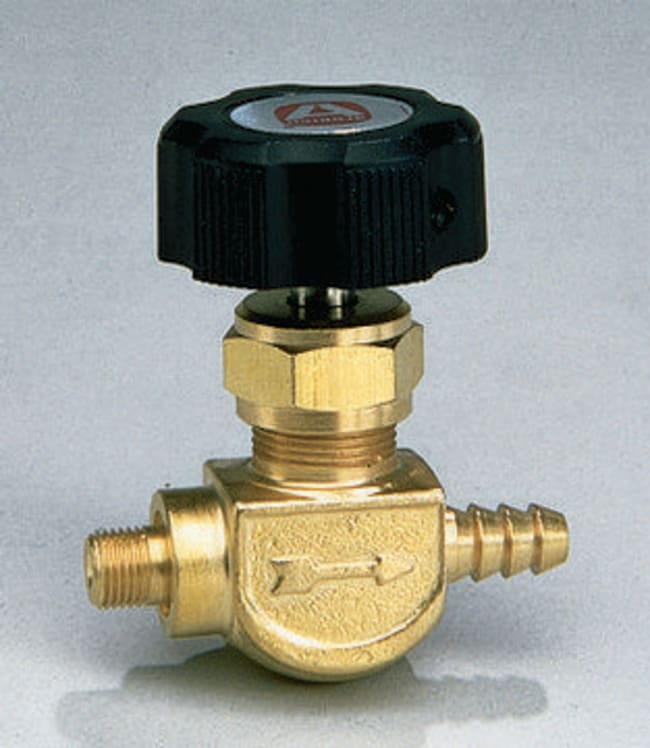 CGA110, straight-pattern valve for precise flow control of lecture-bottle gas. Requires CGA110 PTFE sealing washer.Brass control valve shown.Monel is a registered trademark of Huntington Alloys Corp.