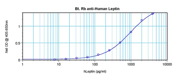 AA Sequence of recombinant protein: MVPIQKVQDD TKTLIKTIVT RINDISHTQS VSSKQKVTGL DFIPGLHPIL TLSKMDQTLA VYQQILTSMP SRNVIQISND LENLRDLLHV LAFSKSCHLP WASGLETLDS LGGVLEASGY STEVVALSRL QGSLQDMLWQ LDLSPGC. Preparation: Produced from sera of rabbits immunized with highly pure Recombinant Human Leptin. Anti-Human Leptin-specific antibody was purified by affinity chromatography and then biotinylated. Sandwich ELISA: To detect Human Leptin by sandwich ELISA (using 100 μL/well antibody solution) a concentration of 0.25-1.0 μg/mL of this antibody is required. This biotinylated polyclonal antibody, in conjunction with PeproTech Polyclonal Anti-Human Leptin (500-P86) as a capture antibody, allows the detection of at least 0.2-0.4 ng/well of Recombinant Human Leptin. Western Blot: To detect hLeptin by Western Blot analysis this antibody can be used at a concentration of 0.1-0.2 μg/mL. Used in conjunction with compatible secondary reagents the detection limit for Recombinant hLeptin is 1.5-3.0 ng/lane, under either reducing or non-reducing conditions. 500-P86BT-1MG will be provided as 2 x 500 μg