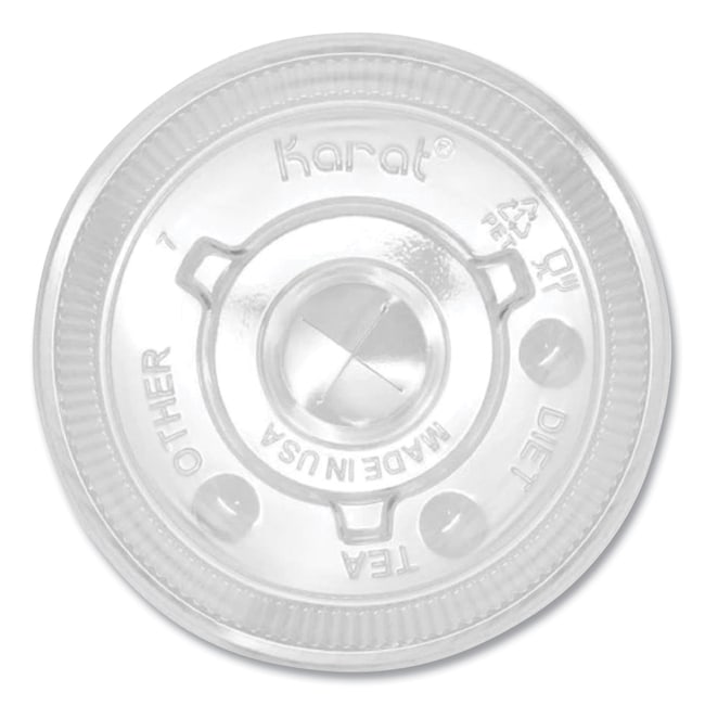 Karat PET lids are durable high clarity and crack resistant They are also recyclable and BPA free Compatible with Karat Cold Cups Flat Lid--Fits cups with 90 mm rim diameter Fits- 12 oz to 22 oz Cold Cups Material Type- Plastic Material(s)- PET Plastic Color(s)- Clear
