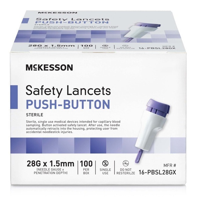 Safety Lancet McKesson 28 Gauge Retractable Push Button Activation Finger Reliability provided by optimized needle exposure of 1.5 mm fixed depth to guarantee adequate blood flow Features gamma-sterilized 28-gauge needles, fully covered and protected with a sterility tab Electro-polished, silicone-coated needle with high puncture speed minimizes pain and facilitates healing for gentle Fingertiptip sampling Enhanced safety with sterility tab and self-destructing activation mechanism Purple color-coded design for easy gauge identification Disposable design for convenient single use