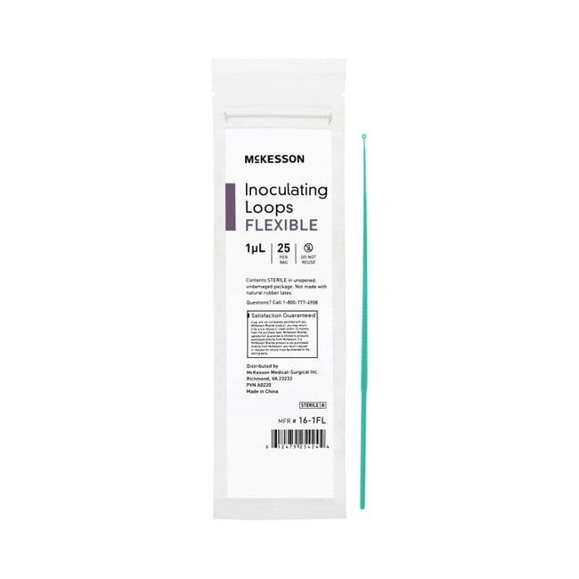 Inoculating Loop McKesson 1 µL High Impact Polystyrene Integrated Handle Sterile Disposables for collection and inoculation by streaking or puncturing methods Smooth construction facilitates uniform streaking of culture media Loop combinations have an integrated loop/needle design, eliminating the need for a separate needle Flexible feel media type Integrated handle Sterilized by gamma irradiation Light green There are 25 calibrated inoculating loops in a tamper-evident resealable bag