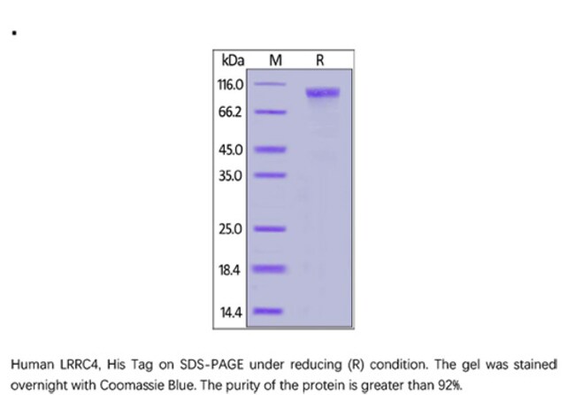 Recombinant Protein;Human LRRC4 Protein;1MG;Human LRRC4, His Tag (LR4-H5221) is expressed from human 293 cells (HEK293). It contains AA Ala 39 - Lys 527 (Accession # AAI11562.1).;This protein carries a polyhistidine tag at the C-terminus. The protein has a calculated MW of 55.6 kDa. The protein migrates as 90-110 kDa under reducing (R) condition (SDS-PAGE) due to glycosylation.