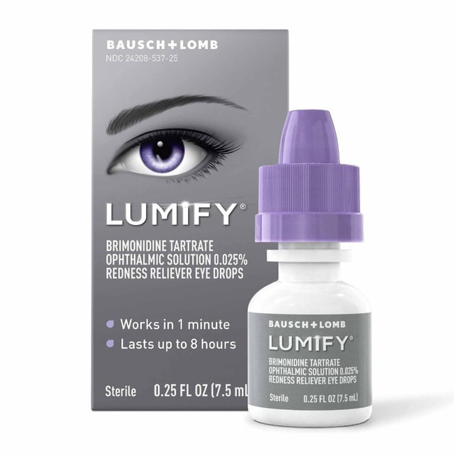 Lumify eliminates redness in eyes in 1 minute and lasts for up to 8 hours Lumify can be used with contacts but be sure to take them out before putting Lumify in your eyes; wait 10 minutes before putting your contacts back in, after use of Lumify The active ingredient in Lumify – ophthalmic brimonidine – is used to lower pressure in the eyes of patients who suffer from certain ophthalmic maladies; Lumify contains just enough – 0.025% – to reduce redness Dropper bottle contains 7.5 mL of 0.025% brimonidine solution