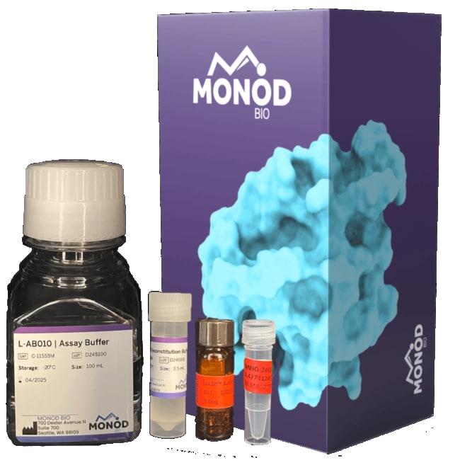 The LuxSit™ s-Pro PPI Kit is a versatile two-component split reporter for studying protein–protein interactions (PPI) and developing custom biosensors. Each kit includes proprietary reagents: (1) reaction buffer, (2) substrate, and (3) substrate reconstitution buffer. Plasmids encoding LuxSit™ s-Pro are sold separately.The Monod Bio LuxSit™ Pro family represents the world’s smallest and highest-performance de novo luciferases. Available as full-length reporters or split complementation systems, the 13.5 kDa ATP-independent enzyme is the first de novo luciferase created using advanced machine-learning design. LuxSit™ Pro is monomeric, highly soluble, thermostable, and expressible in both bacterial and mammalian cells. When paired with the LuxSit™ Pro Assay Buffer and Substrate, it delivers glow-type luminescence several times brighter than Firefly or Renilla luciferases.Learn more at monod.bio
