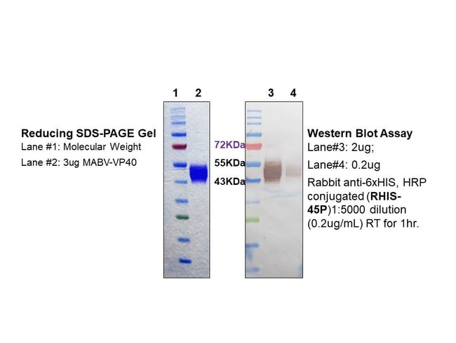 Recombinant Marburg Virus VP40 (UniProt # P35260) with a 6xHIS tag was expressed in CHO cells and purified by nickel affinity chromatography. Estimated purity is >95%.