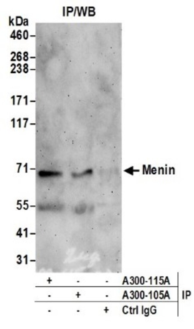 Menin Polyclonal specifically detects Menin in Human samples. It is validated for Western Blot, Immunoprecipitation.Specifications