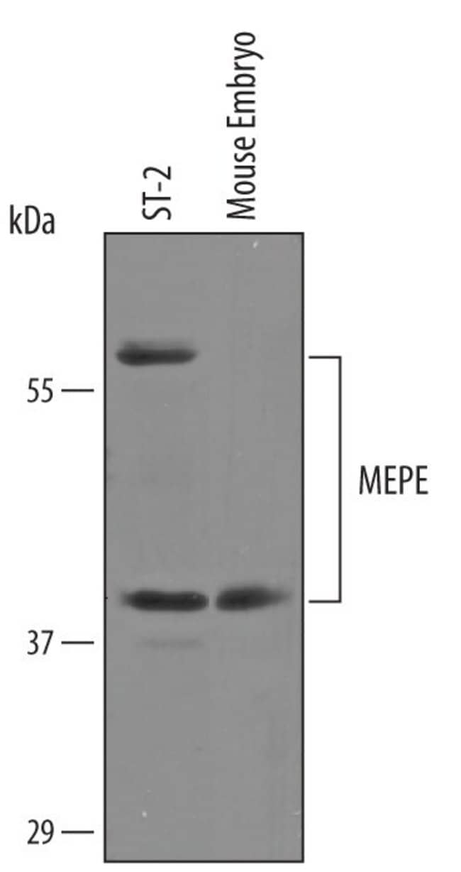 In direct ELISAs, approximately 10% cross-reactivity with recombinant human MEPE/OF45 is observed. Reconstitute at 0.2 mg/mL in sterile PBS.
