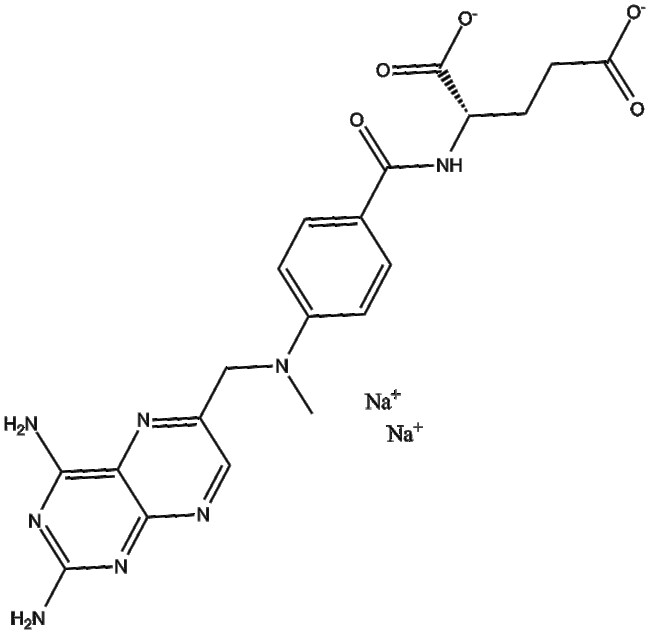 Methotrexate disodium (CAS 7413-34-5) is a small-molecule inhibitor targeting dihydrofolate reductase (DHFR) It is designed to inhibit DHFR activity thereby disrupting the enzymatic reduction of dihydrofolate to tetrahydrofolate and impairing DNA and RNA biosynthesis Methotrexate disodium exerts its biological activity primarily through DHFR inhibition In in vitro studies methotrexate disodium demonstrates inhibitory activity with an IC50 value in the nanomolar range (approximately 5 to 50 nM depending on assay conditions and cell models) Based on these pharmacological properties methotrexate disodium holds research potential in autoimmune disorders such as rheumatoid arthritis and psoriasis as well as in antineoplastic studies involving acute lymphoblastic leukemia