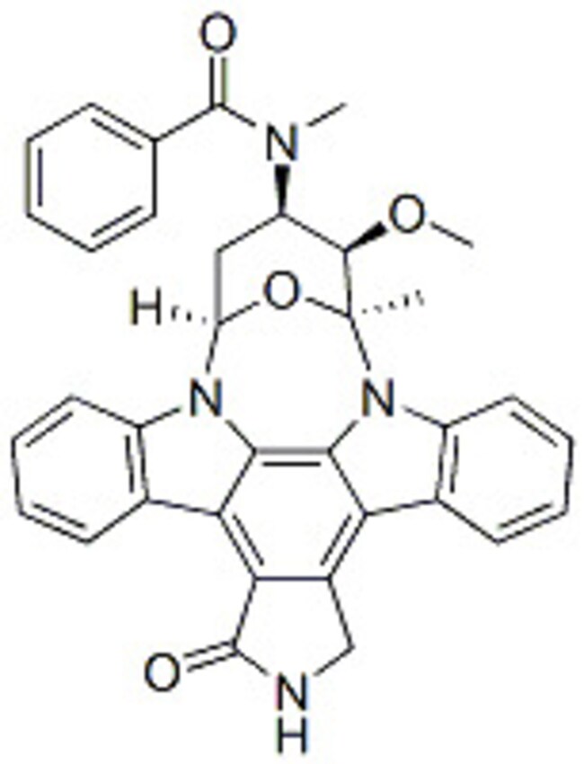 Midostaurin (pkc412, CGP 41251) is a multi-targeted kinase inhibitor, including PKC?/?/?, Syk, Flk-1, Akt, PKA, c-Kit, c-Fgr, c-Src, FLT3, PDFR? and VEGFR1/2 with IC50 ranging from 80-500 nM. *For Research & Development use only. Product is not intended for drug, household, or human consumption.