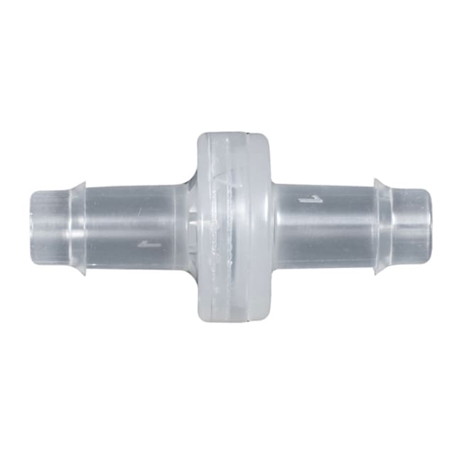 Install these miniature check valves with hose barbs in any position to prevent backflow. They are compatible with both liquids and gases for pressure or vacuum applications. They require 0.18 psi breaking pressure; closing pressure is 0.014 psi.