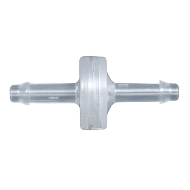 Install these miniature check valves with hose barbs in any position to prevent backflow. They are compatible with both liquids and gases for pressure or vacuum applications. They require 0.18 psi breaking pressure; closing pressure is 0.014 psi.