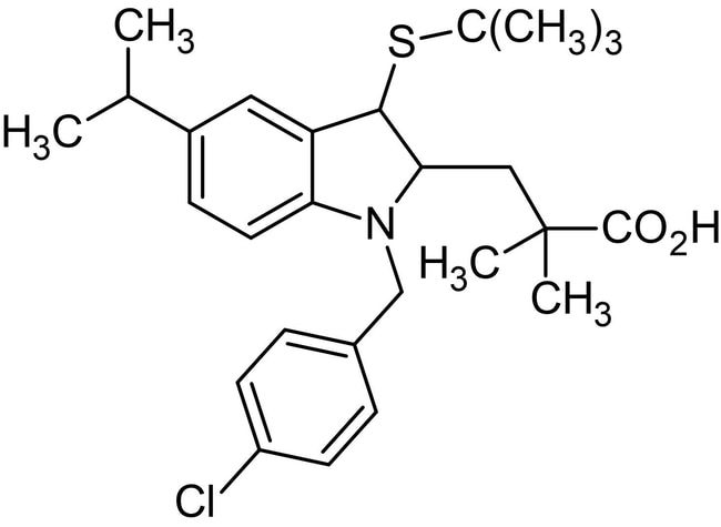 MW 494.1 Da, Purity >98%. Potent 5-lipoxygenase activating protein inhibitor (FLAP) (IC₅₀ = 44 nM). Inhibits leukotriene biosynthesis (IC₅₀ = 2.5 nM) in vitro and tumor activity in vivo. Displays PPARα antagonist activity. Orally active in vivo.