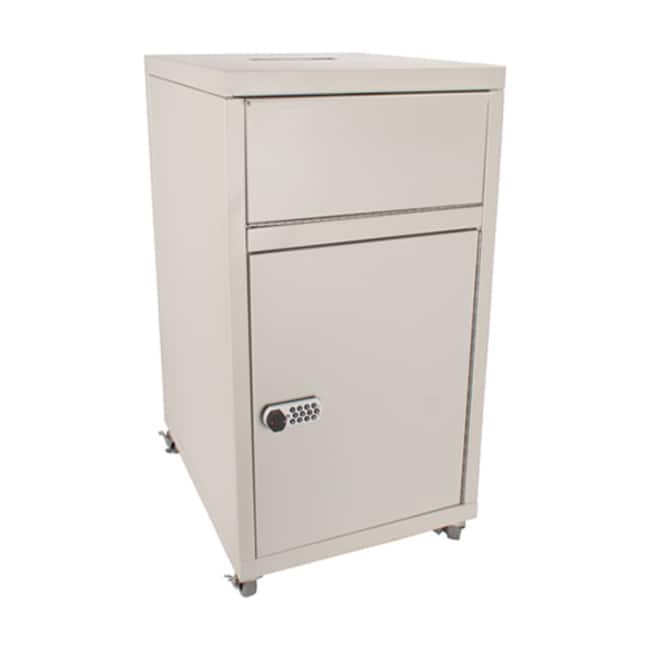 Mobile Specimen Drop Box with Programmable E-Lock safely stores and secures large volume lab specimens for easy retrieval & allows multiple lab techs to access samples through the bottom retrieval door without exchanging keys∙ Easy to program and comes with three different passwords: master, service and user (lock programming instructions included) ∙ Simply key in your code and turn the knob for easy but secure access∙ Allows easy positioning, collection and transport from one location to another∙ Specimens are deposited via the 13.25" W x 4"D front pull-out compartment and retrieved via the bottom key lock compartment that measures 13.5"W x 18.25"H∙ Lab Sample Locking Security Drop Box is designed to accept large volumes of specimen bags, blood tubes, vials, syringes & ampules ∙ Made from powder coated beige, 18 gauge steel ∙ Dimensions: 16"W x 20.5"D x 31"H