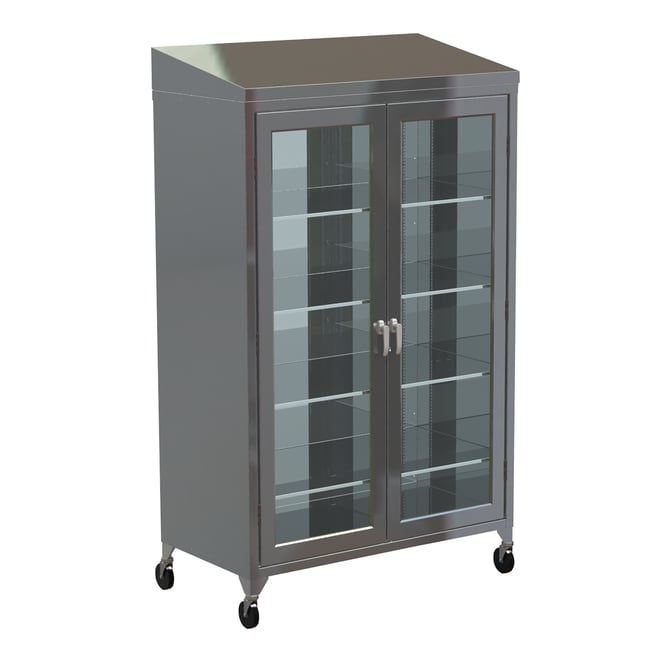 Lakeside can design a custom wall of cabinetry that precisely fits your space and environment. The Lakeside ST-3679PB Mobile Storage Sloped Top Cabinet has a pegboard. Durable construction with stainless steel body, top, bottom, and door frames. 1/4" (6) thick clear tempered glass clearly displays contents. Counter-weighted base for greater stability. Great for combination storage systems. Standard key lock. 4" (102) casters; 2 with brakes. Made in the USA.