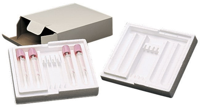 Maximum breakage protection for known non-hazadous blood, serum, tissue, and other specimens. Accommodates VacuTainer Microtainer and other collection / transport tubes. Lightweight polystyrene foam construction saves postage. Reusable and recyclable. Holds 4 tubes, 110 x 19ml, 8 slides, 408 Mailing Sleeve.