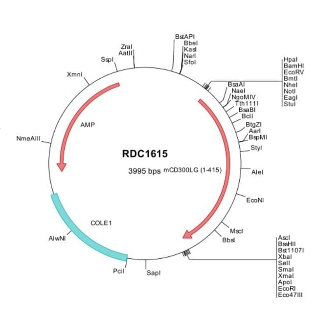 This shuttle vector contains the complete ORF for the gene of interest, along with a Kozak consensus sequence for optimal translation initiation. It is inserted NotI to AscI. The gene insert is flanked with convenient multiple cloning sites which can be used to easily cut and transfer the gene cassette into your desired expression vector.