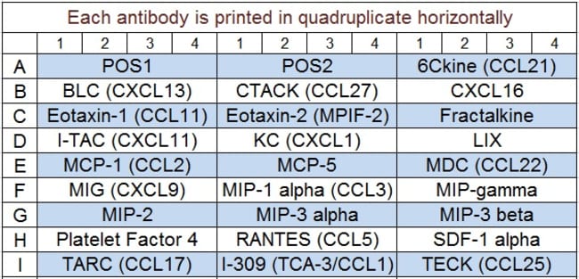 Detects 25 Mouse Chemokines. Suitable for all liquid sample types. Quantitative, Sandwich-based, Glass Slide Antibody Array. Simultaneous quantitative measurement of multiple proteins in a wide variety of sample types. Quantibody combines the high specificity and sensitivity of ELISA with the high throughput of the glass chip-based array. Less sample, more data: only 50 ul of sample is needed for quantification of up to 40 cytokines. Proteins detected: 6Ckine (CCL21), BLC (CXCL13), CTACK (CCL27), CXCL16, Eotaxin-1 (CCL11), Eotaxin-2 (MPIF-2/CCL24), Fractalkine (CX3CL1), I-309 (TCA-3/CCL1), I-TAC (CXCL11), KC (CXCL1), LIX, MCP-1 (CCL2), MCP-5, MDC (CCL22), MIG (CXCL9), MIP-1 alpha (CCL3), MIP-1 gamma, MIP-2, MIP-3 alpha (CCL20), MIP-3 beta (CCL19), Platelet Factor 4 (CXCL4), RANTES (CCL5), SDF-1 alpha (CXCL12 alpha), TARC (CCL17), TECK (CCL25)
