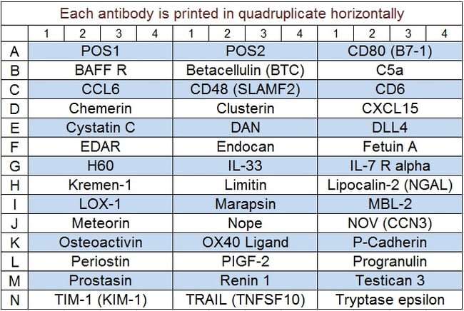 Detects 40 Mouse Cytokines. Suitable for all liquid sample types. Quantitative, Sandwich-based, Glass Slide Antibody Array. Simultaneous quantitative measurement of multiple proteins in a wide variety of sample types. Quantibody combines the high specificity and sensitivity of ELISA with the high throughput of the glass chip-based array. Less sample, more data: only 50 ul of sample is needed for quantification of up to 40 cytokines. Proteins detected: BAFF R, Betacellulin (BTC), C5a, CCL6, CD48 (SLAMF2), CD6, CD80 (B7-1), Chemerin, Clusterin, Cystatin C, DAN, DLL4, EDAR, Endocan, Fetuin A, H60, IL-33 (IL-1 F11), IL-7 R alpha, Kremen-1, Limitin, Lipocalin-2 (NGAL), LOX-1, Lungkine (CXCL15), Marapsin, MBL-2, Meteorin, Nope, NOV (CCN3), Osteoactivin (GPNMB), OX40 Ligand, P-Cadherin, Periostin, PlGF-2, Progranulin, Prostasin, Renin 1, Testican 3, TIM-1 (KIM-1), TRAIL (TNFSF10), Tryptase epsilon
