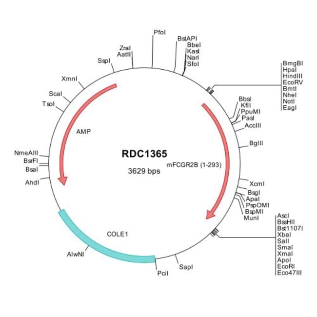 This shuttle vector contains the complete ORF for the gene of interest, along with a Kozak consensus sequence for optimal translation initiation. It is inserted NotI to AscI. The gene insert is flanked with convenient multiple cloning sites which can be used to easily cut and transfer the gene cassette into your desired expression vector.