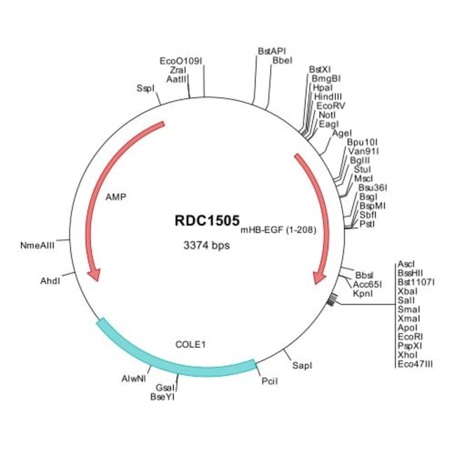 The Mouse HB-EGF (NP_034545) VersaClone cDNA clone contains the complete ORF for HB-EGF, along with a Kozak consensus sequence for optimal translation initiation. The gene insert is flanked with convenient multiple cloning sites which can be used to easily cut and transfer the gene cassette into your desired expression vector. The HB-EGF insert is sequence verified and the entire plasmid DNA and insert translated sequences are provided.