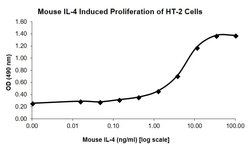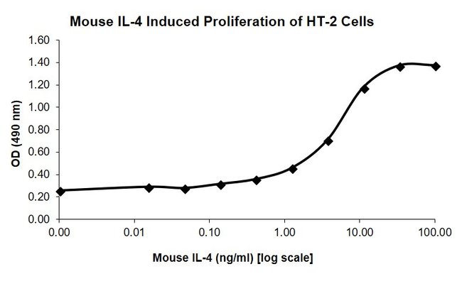 Recombinant mouse IL-4 is a non-glycosylated protein containing 121 amino acids. Reconstitute using sterile water at 0.1 mg/mL and centrifuge prior to opening vial. Gently pipet solution down the sides of the vial. DO NOT VORTEX sample. Store reconstituted material at -20°C and add 0.1% BSA for additional stability.