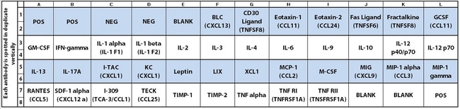 Detects 40 Mouse Inflammatory Factors. Suitable for all liquid sample types. Semi-Quantitative, Sandwich-based, Membrane Antibody Array. Screen and compare protein expression levels with high specificity and sensitivity (pg/ml levels). No dedicated equipment required. Compatible with any chemiluminescent imaging system. Proteins detected: BLC (CXCL13), CD30 Ligand (TNFSF8), Eotaxin-1 (CCL11), Eotaxin-2 (MPIF-2/CCL24), Fas Ligand (TNFSF6), Fractalkine (CX3CL1), GCSF, GM-CSF, IFN-gamma, IL-1 alpha (IL-1 F1), IL-1 beta (IL-1 F2), IL-2, IL-3, IL-4, IL-6, IL-9, IL-10, IL-12 p40/p70, IL-12 p70, IL-13, IL-17A, I-TAC (CXCL11), KC (CXCL1), Leptin, LIX, Lymphotactin (XCL1), MCP-1 (CCL2), M-CSF, MIG (CXCL9), MIP-1 alpha (CCL3), MIP-1 gamma, RANTES (CCL5), SDF-1 alpha (CXCL12 alpha), I-309 (TCA-3/CCL1), TECK (CCL25), TIMP-1, TIMP-2, TNF alpha, TNF RI (TNFRSF1A), TNF RII (TNFRSF1B)