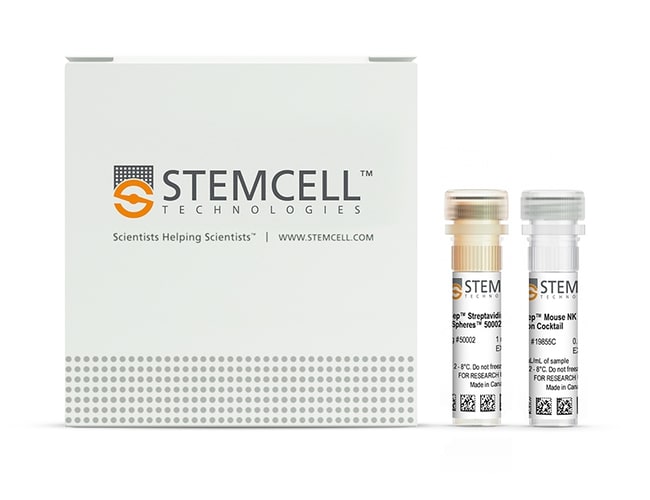 The EasySep™ Mouse NK Cell Isolation Kit targets non-NK cells by labeling unwanted cells with biotinylated antibodies and EasySep™ Streptavidin RapidSpheres™, and separates cells without columns using an EasySep™ magnet. Desired cells are simply poured off into a new tube. Isolated cells are immediately available for downstream applications such as flow cytometry, culture or cell-based assays.This product replaces the EasySep™ Mouse NK Cell Enrichment Kit (Catalog #19755) for even faster cell isolations.