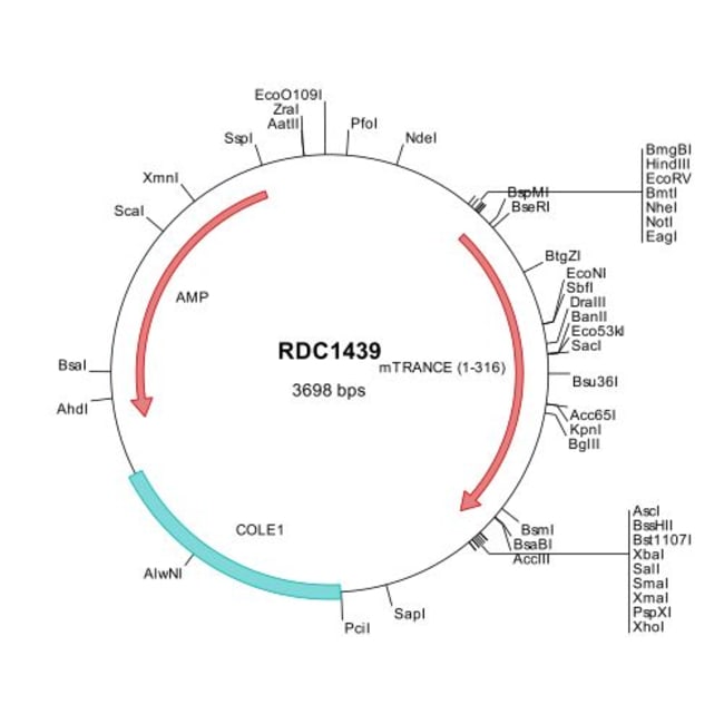 This shuttle vector contains the complete ORF for the gene of interest, along with a Kozak consensus sequence for optimal translation initiation. It is inserted NotI to AscI. The gene insert is flanked with convenient multiple cloning sites which can be used to easily cut and transfer the gene cassette into your desired expression vector.
