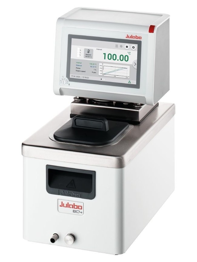 MAGIO™ MS-BC4 heating circulator with 4L bath tank and lid with 1 kW heating power to +300 °C. Large, color touchscreen UI with built-in help functions. For internal and external temperature applications. Includes Intelligent Cascade Control, self-optimizing for optimum results with settings for band limit, limit setting, co-speed factor and control dynamics. Variable speed pressure / suction pump 13-31 L/min; 3.5-13.3 PSI. Built-in cooling coil enables counter cooling with tap water. Barbed fittings for 8 or 12mm ID tubing included (pump connections M16x1 male). Includes Pt100 connection for external monitoring/control, RS232/RS485, USB and Ethernet ports with optional slot for analog communication (requires module 9900100). Modbus TCP/IP incorporated. Stakei port for external accessory control (solenoid valve, etc). Class III (FL) according to DIN 12876-1. Includes bath lid and integrated drain port.
