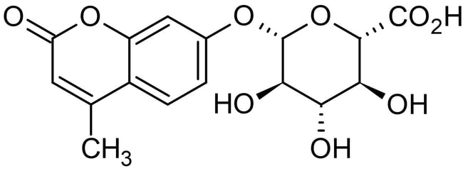 MW 388.33 g/mol, Purity >99%. Fluorescent substrate for β-glucuronidase. Once cleaved, yields a blue fluorescent end product that can be monitored by UV light. Typically used in the β-glucuronidase (GUS) reporter system, for fluorescent detection of β-glucuronidase gene expression in Escherichia coli and transformed plants.
