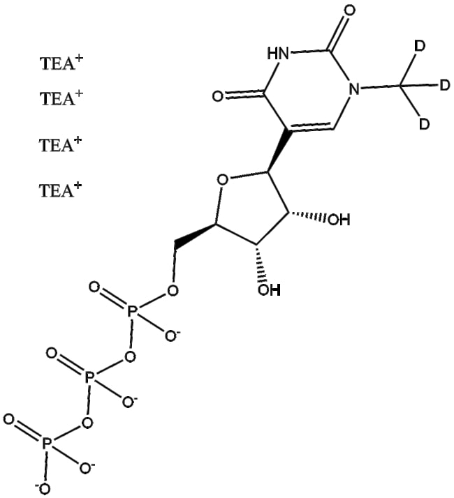N1-Methylpseudo-UTP D3 is a chemically modified nucleotide analog labeled with deuterium It is designed to substitute conventional uridine triphosphate during enzymatic transcription reactions allowing for the synthesis of isotope-labeled RNA N1-Methylpseudo-UTP D3 exerts its function through incorporation into RNA thereby conferring distinct structural and biochemical properties to RNA transcripts Based on these properties N1-Methylpseudo-UTP D3 holds research potential in structural analyses of RNA RNA-protein interaction studies and biophysical investigations including nuclear magnetic resonance (NMR) spectroscopy