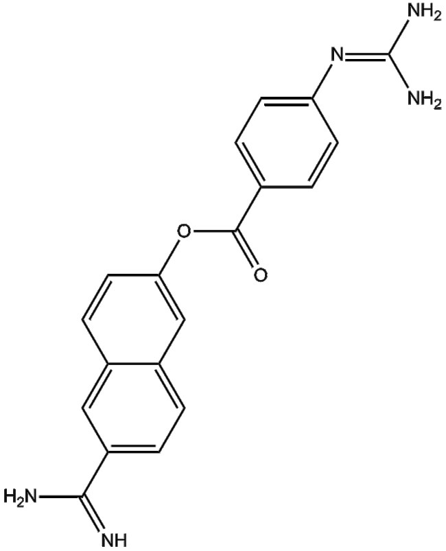 Nafamostat (CAS 81525-10-2) is a small-molecule inhibitor targeting a broad spectrum of serine proteases including thrombin plasmin kallikrein and human trypsin It is designed to block protease-mediated hydrolysis reactions thereby regulating coagulation pathways and inflammation-related protease activity Nafamostat exerts its biological activity primarily through reversible binding to protease active sites inhibiting their enzymatic functions In biochemical assays Nafamostat demonstrates potent inhibitory activity with an IC50 value of approximately 1 10 nM against human trypsin Based on these pharmacological properties Nafamostat holds research potential in coagulation pathway studies inflammation-related protease research pancreatitis modeling and mechanistic investigations of blood coagulation disorders and inflammatory responses