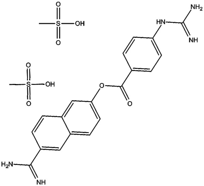 Nafamostat Mesylate (FUT-175) is a serine protease inhibitor originally identified for its inhibitory activity on complement activation pathways Mechanistically it effectively targets multiple serine proteases involved in the coagulation cascade including trypsin thereby interfering with protease-mediated signaling processes It shows inhibitory activity against human trypsin-catalyzed hydrolysis of Boc-Phe-Ser-Arg-MCA substrate with a reported Ki value of 95 3 pM Nafamostat Mesylate has been investigated extensively in experimental models related to inflammatory responses such as acute pancreatitis and conditions associated with disseminated intravascular coagulation (DIC) Moreover recent studies indicate dose-dependent antibacterial activity in vitro particularly against intracellular pathogens like Chlamydia