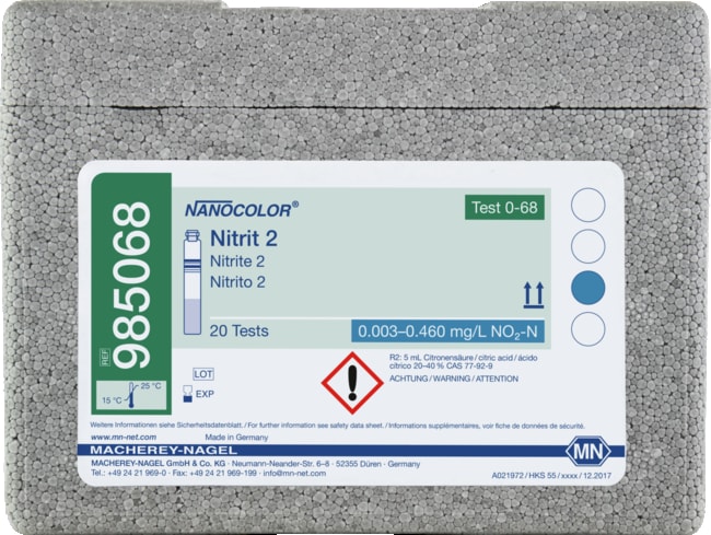 Tube test for the determination of Nitrite. Precise rapid tests for all kind of water and waste water samples. Time-saving and reliable analysis together with Macherey-Nagel NANOCOLOR photometers. Measuring range: Nitrite - 0.003–0.460 mg/L NO₂-N, Nitrite - 0.02–1.50 mg/L NO₂⁻Manufactured by Macherey-Nagel