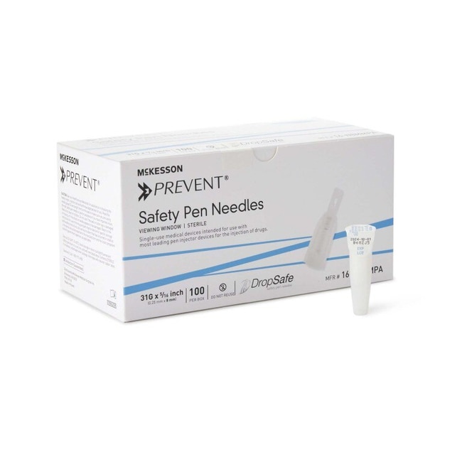 Insulin Pen Needle McKesson Prevent 31 Gauge 5/16 Inch Length Safety Shield Automatic needle lock-out; appearance of red stripes confirms that the needle has been used and is ready to be disposed of safely Reduces user discomfort due to thinner needle (31G) Viewing window allows easy visibility to needle tip during priming to prevent unnecessary drug waste Wing-shaped design for comfortable and secure grip Regular bevel Stainless steel needle is a 5/16 inch in length