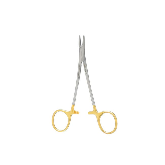 Halsey needle holders are most commonly used for holding suture needles during surgical procedures. It features a cross-hatched and reliable non-slip surface that allows firm gripping of needles during surgical procedures. Ideally used for plastic surgery. Put together with medical grade German steel. Serrated jaws for improved grip. 5.25in total length. 4000 teeth per square " Tungsten carbide inlays provide increased durability against corrosion and abrasions.