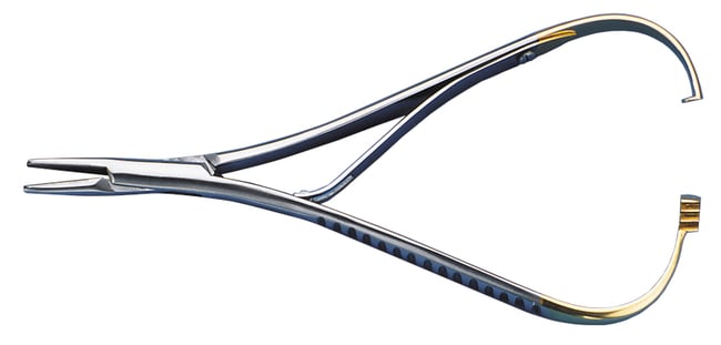 Mathieu Fine Needle Holders are a precision surgical instrument for microsurgery. They were designed for use in dentistry and oral surgery by French surgeon Jules-Émile Péan Mathieu. Their unique design features a ratchet lock mechanism in the handle, and fine, slender, serrated tips. You will also notice the ring handles are replaced with ergonomic, spring-style handles. The ratchet lock allows the operator to have a light touch with a secure hold for manipulating a suture needle without having to apply constant pressure on the handles. The design of the locking mechanism reduces hand fatigue. Conventional needle holders have ring handles or spring handles. Instead of finger rings or traditional spring handles, Mathieu Needle Holders have curved and elongated handles that are designed to be held between the thumb and ring finger. This design provides a more ergonomic grip and better control over the instrument.