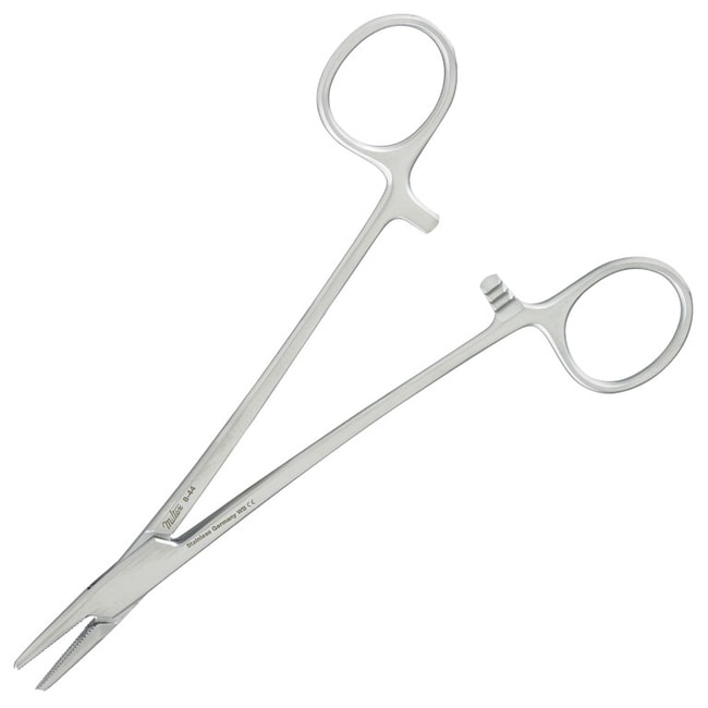 The Miltex 8-44 Mayo-Hegar Needle Holder are used in a variety of surgical procedures. Mayo-Hegar needle holders are one of the most commonly used surgical instruments for both human and veterinary procedures. These needle holders are made of German grade stainless steel and a length of 6in..