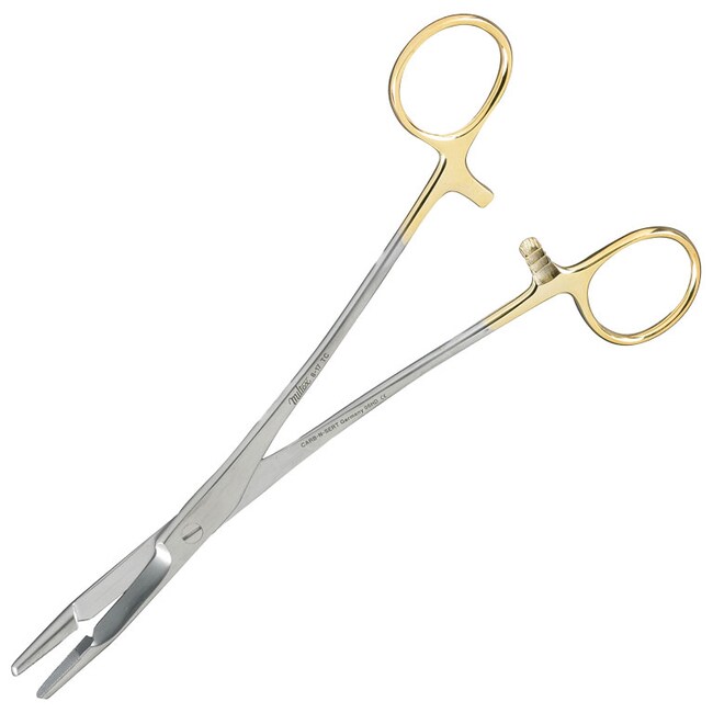 The Miltex 8-17TC Olsen-Hegar Needle Holder have a length of 7.5in.. These Olsen-Hegar Needle holders are made of German grade stainless steel and Tungsten Carbide. They are a convenient surgical instruments as they have a blade at the end of the jaws.
