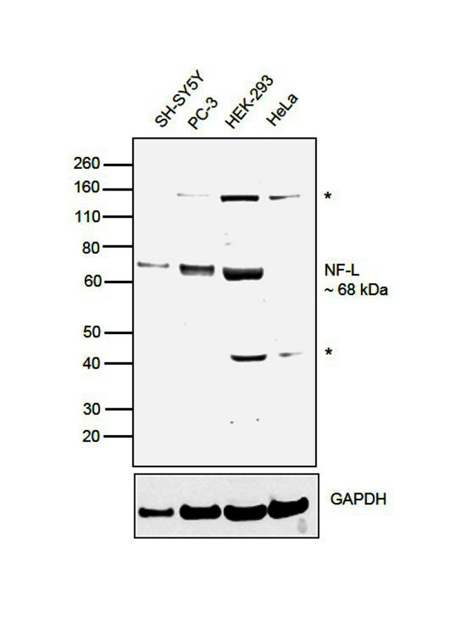 Involved in the maintenance of neuronal caliber, neurofilaments are the intermediate filament proteins found specifically in neurons, and are composed predominantly of three major proteins called NF-L, NF-M and NF-H. Like most other intermediate filament proteins (IFPs), the expression of the different neuronal IFPs is both tissue-specific and developmentally regulated. NF-L is the light or low molecular weight microfilament subunit and runs on SDS-PAGE gels at approximately 70 kDa. Neurofilament are the 10nm or intermediate filament proteins found specifically in neurons, and are composed predominantly of three major proteins called NF-L, NF-M and NF-H. NF-H is the heavy or high molecular weight microfilament subunit and runs on SDS-PAGE gels in the range 180-220 kDa, with some variation in different species.