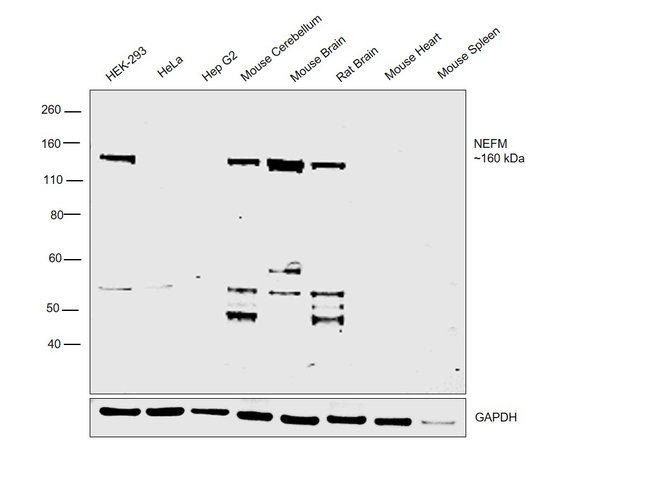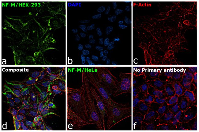 Neurofilaments (NFs) are a type of intermediate filament (IF) expressed almost exclusively in neuronal cells, and in those cells most prominently in large axons. NFs, in most vertebrates, are composed of three different polypeptide chains with different molecular weights - neurofilament medium protein (NF-M), high (NF-H) and light protein (NF-L), which share sequence and structural similarity in a coiled-coil core domain, but differ in the length and sequence of their N-termini and more dramatically of their C-termini which in the case of NF-M and NF-H form the flexible extensions that link NFs to each other and to other elements in the cytoplasm. NF-M protein tail-mediated interactions of neurofilaments are critical for size and cytoskeletal architecture of axons, and are mediated, in part, by the highly phosphorylated tail domain of this protein. NF-M phosphorylation and O-GlcNAcylation are regulated reciprocally and affect its translocation and filament formation and function. Antibodies to the various neurofilament subunits are very useful cell type markers since the proteins are among the most abundant of the nervous system, are expressed only in neurons and are biochemically very stable.