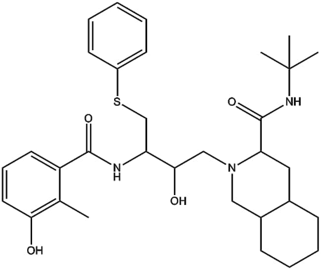Nelfinavir is a selective inhibitor of HIV-1 protease which is responsible for cleaving viral precursor proteins into functional units essential for HIV replication By disrupting this proteolytic step nelfinavir inhibits viral maturation and subsequent infectivity In biochemical assays nelfinavir demonstrates inhibitory activity against HIV-1 protease with an IC50 value typically ranging from 2 to 10 nM Due to its defined mechanism of action nelfinavir is commonly utilized in biomedical research focusing on HIV pathogenesis including antiviral activity studies viral resistance profiling and therapeutic combination assessments in vitro and in cell-based experimental models