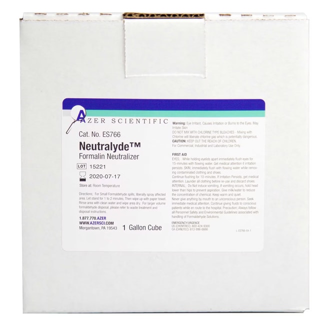 - One gallon of Neutralyde™ for five gallons of 10% formalin waste safe gentle reaction
